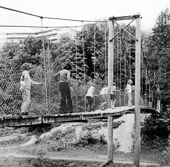 In 1973, the grade ten students from Downsview Secondary School built a suspension bridge across the ravine as part of their workshop experience. The bridge crossed the river from the Pottery Field. It was dismantled around 1980 when it was considered an insurance liability.