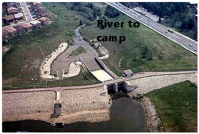 Boat races on the river. 1961. Before the G. Ross Lord Dam was built – just north of camp – the level of the river changed regularly with the rainfall. When water levels were low, the river was accessible for activities like the one seen here. After storms, the river would run very fast and very high and signs were posted warning campers and staff to stay away. After the dam was built in 1973, the water level was kept consistently higher and the river essentially became off limits to camp activities. The following aerial photos show camp before and after construction of the G. Ross Lord Dam: